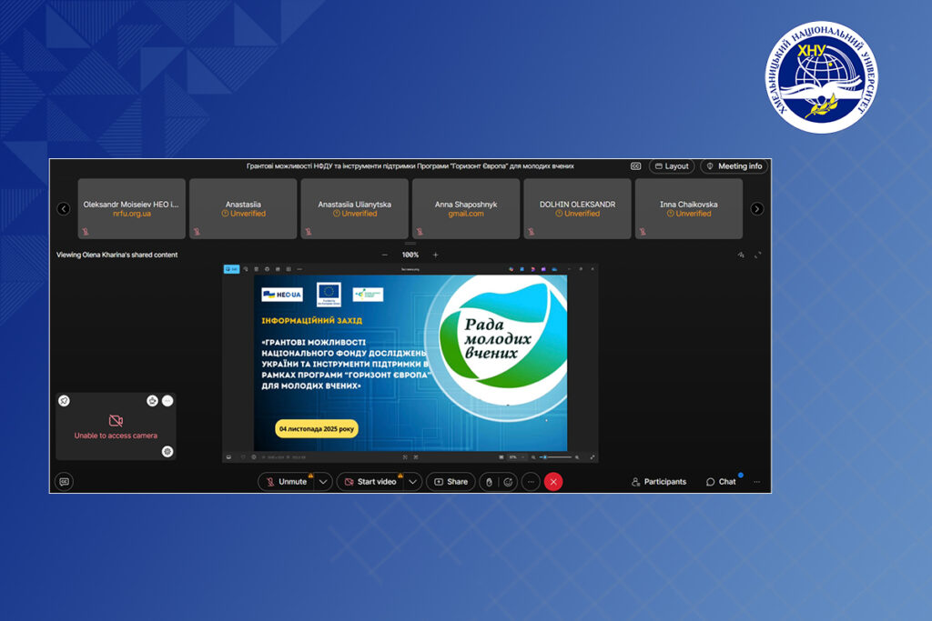 - Участь молодих вчених ХНУ в інформаційному заході «Грантові можливості Національного фонду досліджень України та інструменти підтримки в рамках Програми «Горизонт Європа» для молодих вчених»