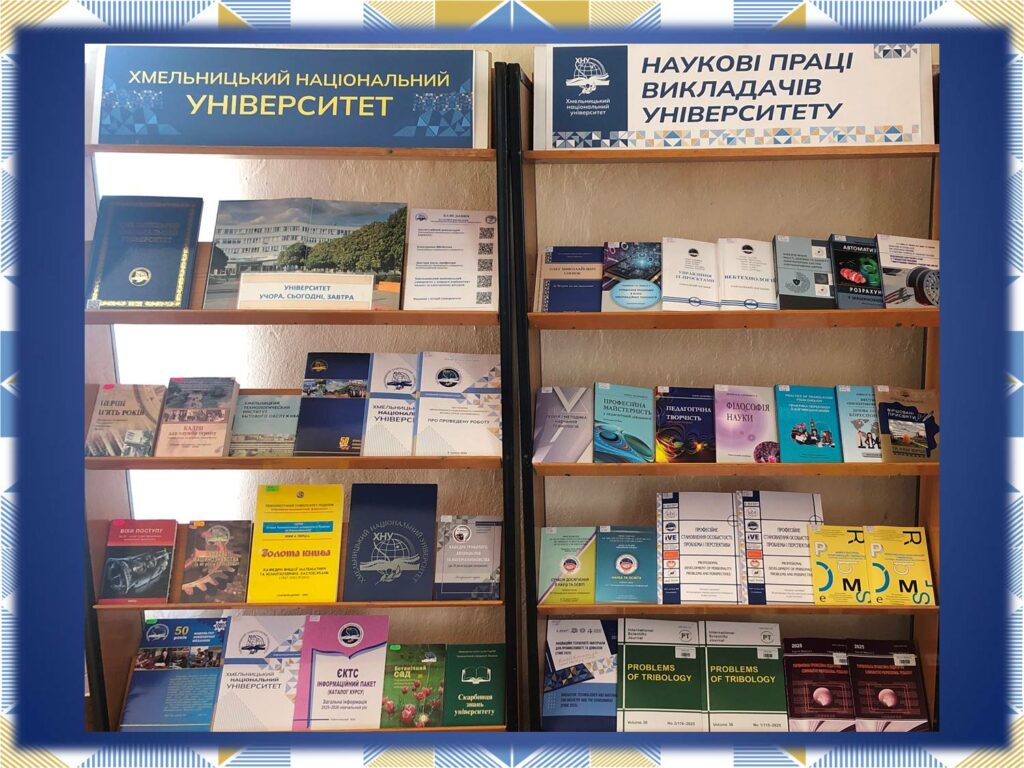– виставку видань викладачів Хмельницького національного університету за 2025 рік, що висвітлює нові здобутки науковців вишу (у межах постійно діючої виставки «Наукові праці викладачів університету») − читальний зал, 7-й поверх;