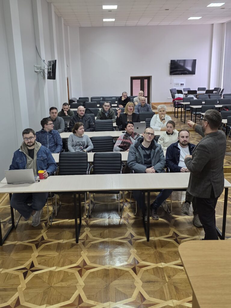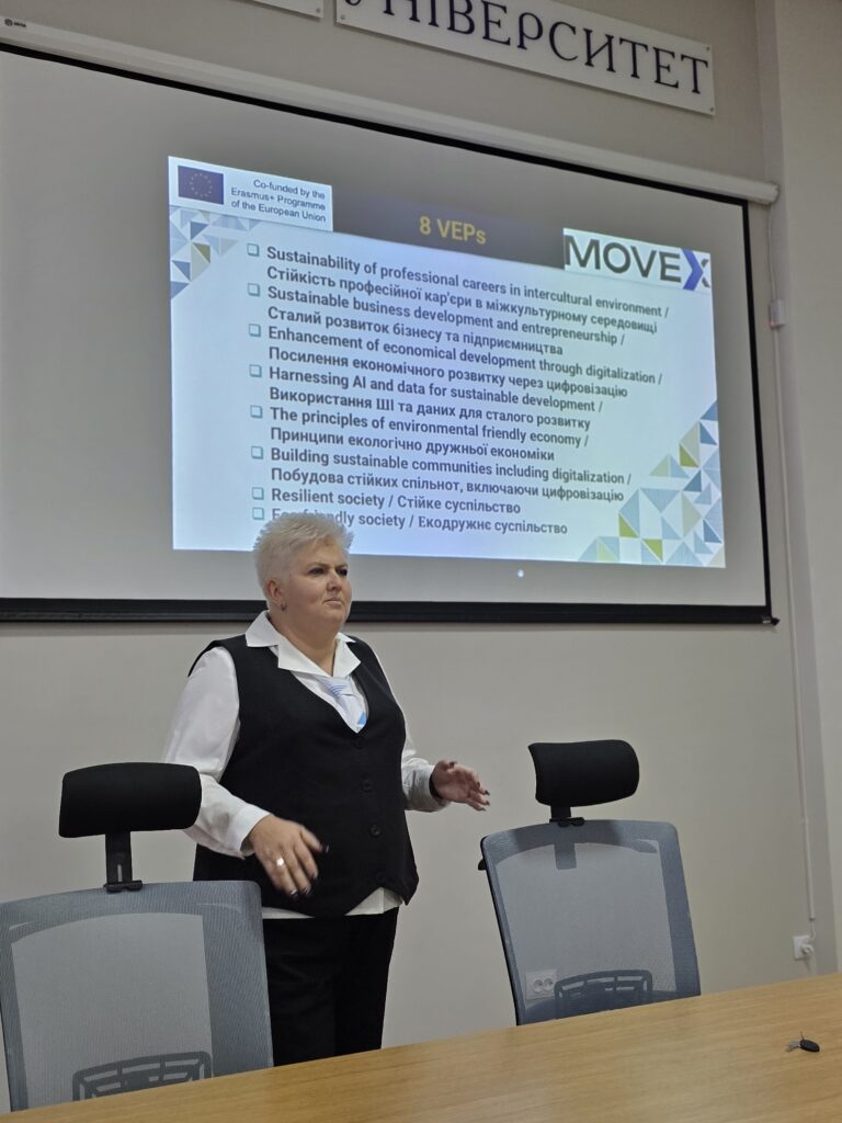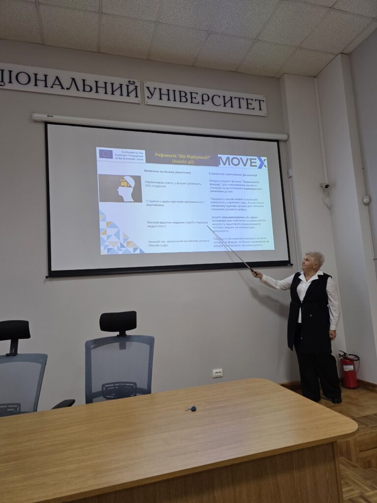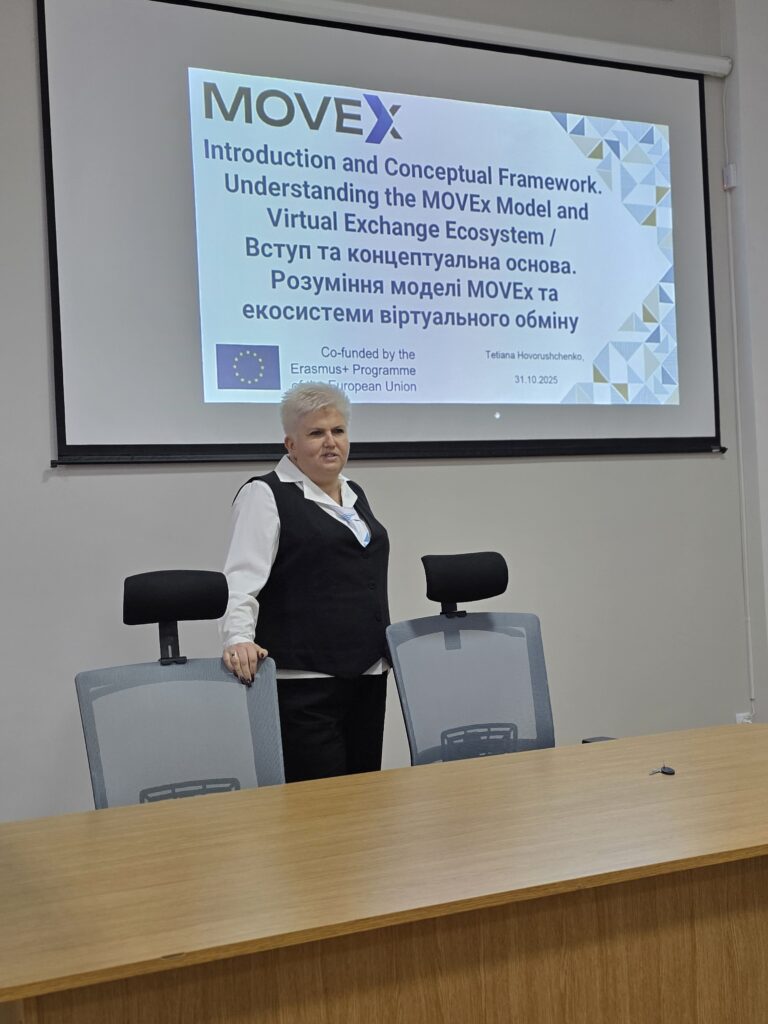 Перший тренінг на тему «Вступ та концептуальна основа. Розуміння моделі MOVEx та екосистеми віртуального обміну» відбувся 31 жовтня 2025 року, тренер – декан ФІТ Тетяна Говорущенко. На цьому тренінгу обговорили можливості віртуального обміну у європейській вищій освіті, розглянули модель віртуальних обмінів MOVEx, а також педагогічні основи віртуальних обмінів. Спільно попрацювали над груповою вправою «Мапування ролі фасилітатора».