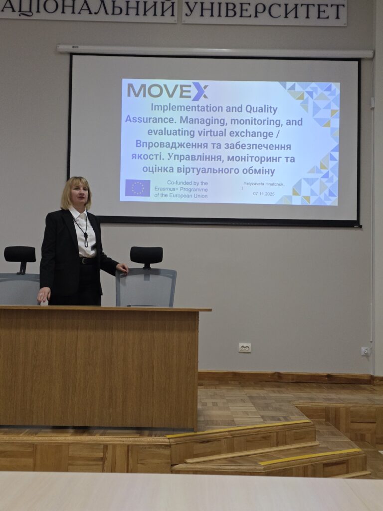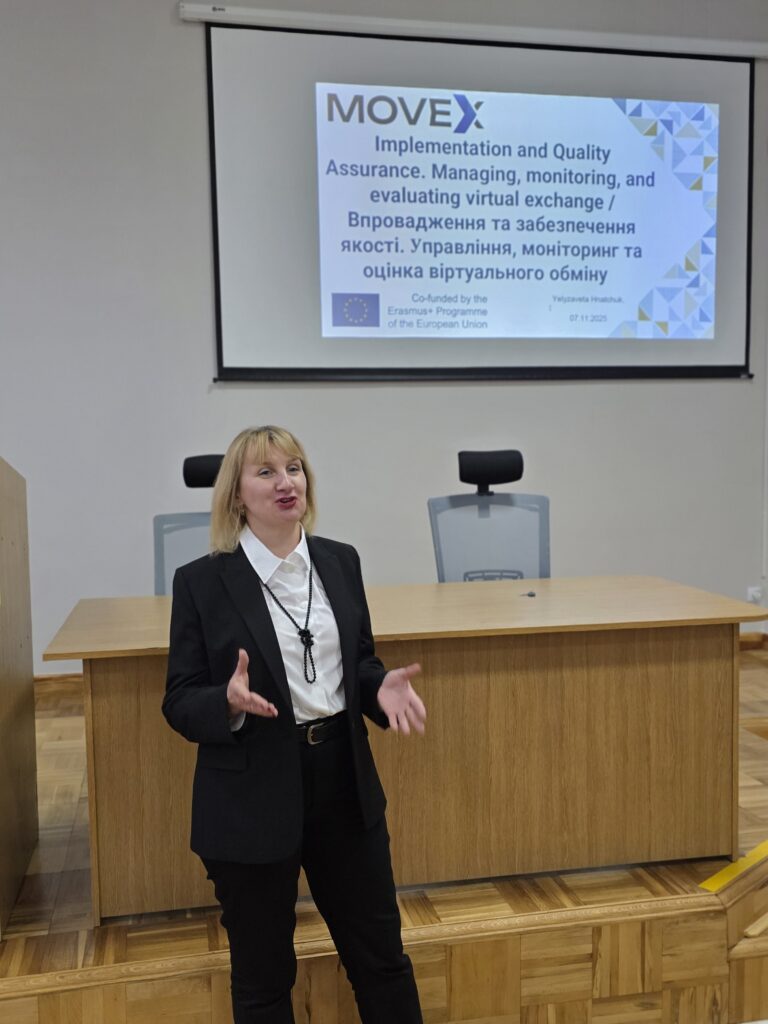 Четвертий тренінг на тему «Впровадження та забезпечення якості. Управління, моніторинг та оцінка віртуального обміну» відбувся 7 листопада 2025 року, тренер – професорка кафедри КІІС Єлизавета Гнатчук. На цьому тренінгу обговорили шляхи досягнення якості при реалізації віртуальних академічних обмінів MOVex, розглянули інституційні аспекти якості вищої освіти та звітність за проєктом щодо якості викладання. Спільно попрацювали над практичним завданням щодо розроблення плану якості та оцінювання, а також над колегіальною оцінкою запропонованих у проєкті програм віртуальних обмінів.