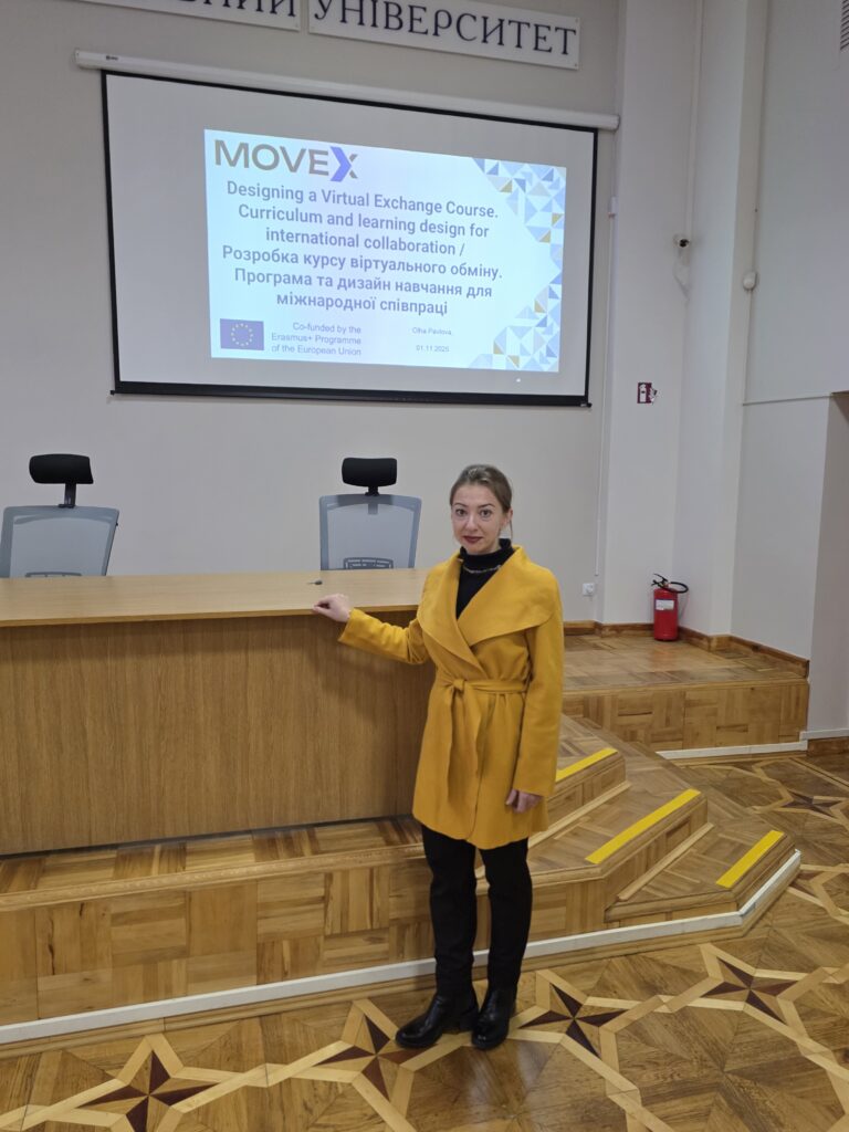 Другий тренінг на тему «Розробка курсу віртуального обміну. Програма та дизайн навчання для міжнародної співпраці» відбувся 1 листопада 2025 року, тренер – завідувачка кафедри КІІС Ольга Павлова. На цьому тренінгу обговорили результати навчання та розробку microcredentials, розглянули структуру курсу та силабус в MOVEx, обговорили стратегії оцінювання у віртуальних обмінах. Спільно попрацювали над практичним завданням щодо розробки силабусу microcredential.