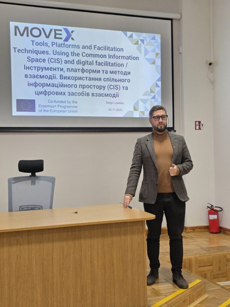 Третій тренінг на тему «Інструменти, платформи та методи взаємодії. Використання спільного інформаційного простору (CIS) та цифрових засобів взаємодії» відбувся 4 листопада 2025 року, тренер – заступник декана ФІТ з наукової та міжнародної роботи Сергій Лисенко. На цьому тренінгу фасилітаторам була продемонстрована платформа спільного інформаційного простору, розроблена командою ХНУ під час реалізації проєкту MOVEX, та її навчальні інструменти, обговорили доступні інструменти комунікації та співпраці. Спільно попрацювали над практичним завданням щодо сприяння онлайн-взаємодії, вирішення проблем та кризових сценаріїв.