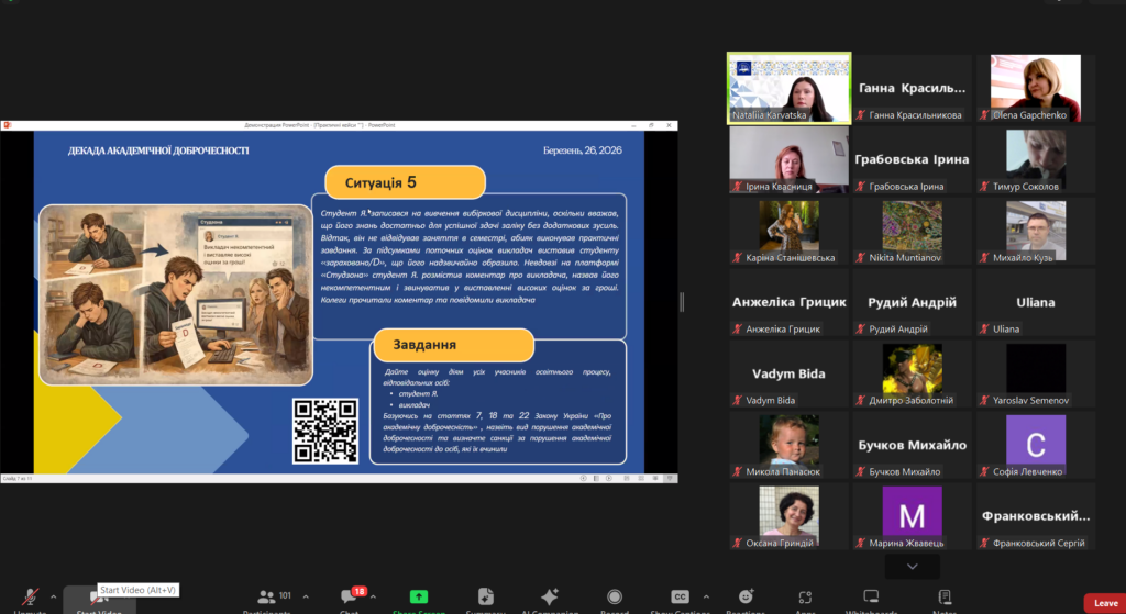 Фахівці відділу забезпечення якості вищої освіти Наталія Карвацка та Ганна Красильникова з метою ознайомлення здобувачів вищої освіти  з основними нормативними засадами у сфері академічної доброчесності розповіли про «Незмінні цінності в новому Законі України «Про академічну доброчесність».