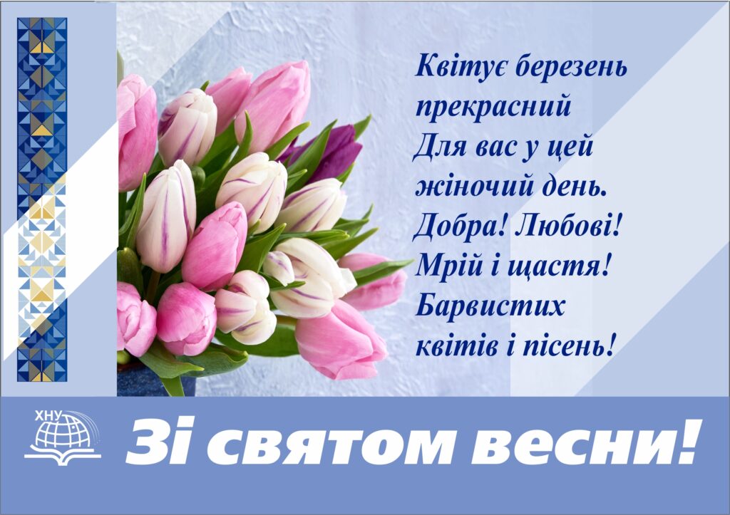 Бажаємо усім жінкам та дівчатам нашої університетської родини здоров’я, натхнення та нових успіхів, тепла, радості, творчого розквіту і справжнього щастя. Нехай кожен день приносить нові можливості, а весна – оновлення, світлі надії та мирне майбутнє.