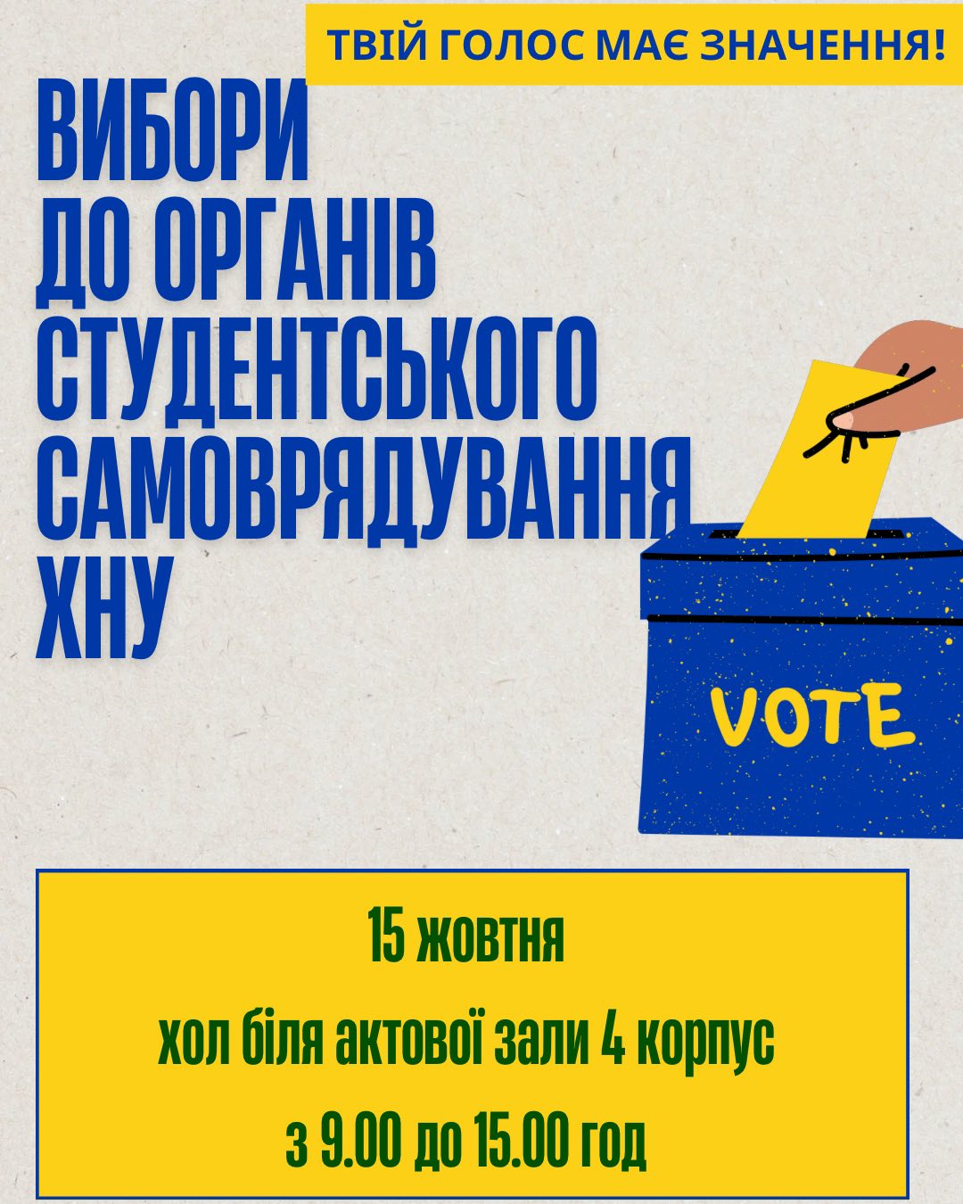 15 жовтня з 9.00 до 15.00 год у холі 4 корпусу біля актової зали відбудуться ВИБОРИ до органів студентського самоврядування факультетів та університету.