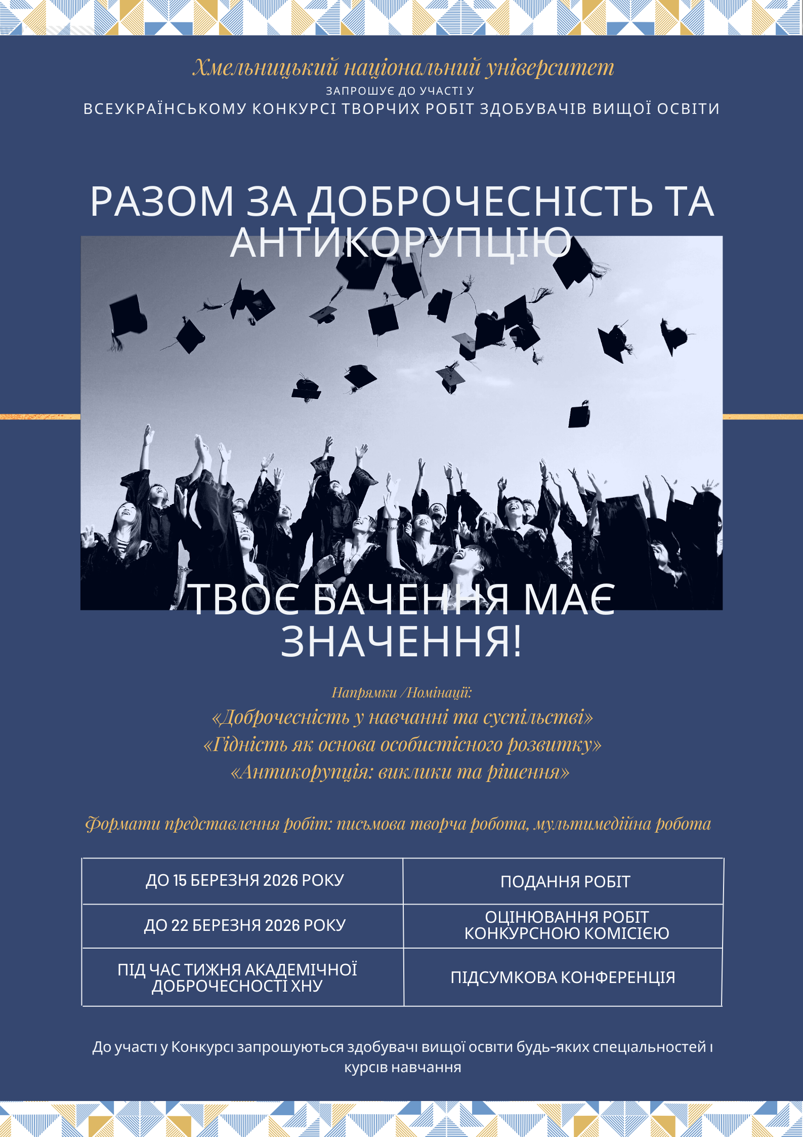 З метою розбудови доброчесного освітнього середовища, запобігання та протидії корупції, сприяння формуванню активної громадянської позиції студентської молоді, розвитку усвідомлення принципів етичної поведінки, підвищенню рівня обізнаності здобувачів вищої освіти щодо корупційних ризиків і викликів, а також утвердженню культури доброчесності, нульової толерантності до порушень та етичного професійного становлення шляхом залучення майбутніх фахівців до антикорупційних ініціатив, запрошуємо здобувачів вищої освіти усіх спеціальностей і курсів навчання до участі у конкурсі творчих робіт на тему
