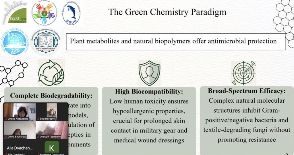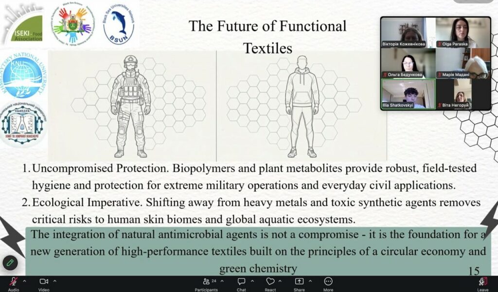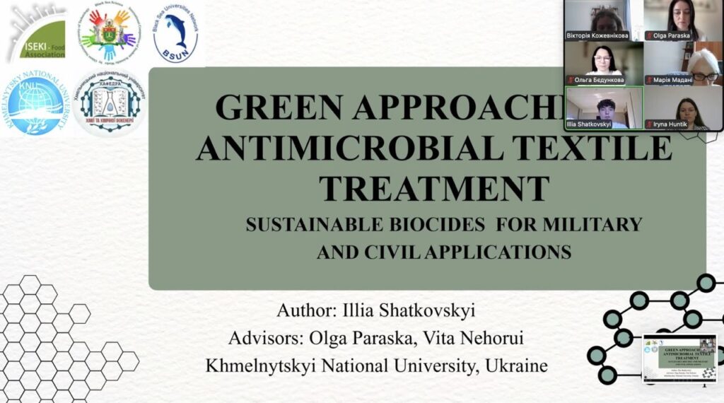За кожним напрямом були визначені фіналісти робіт згідно з рейтингом, які запрошені до участі у другому етапі конкурсу. Серед фіналістів напряму екологія та охорона навколишнього середовища була наукова робота студента групи ХТІ-25-1 кафедри хімії та хімічної інженерії Іллі Шатковського під керівництвом професора Ольги Параски та викладача Віти Негоруй на тему «Екологічні (зелені) підходи до антимікробної обробки текстилю військового та цивільного застосування» (Green approaches to antimicrobial treatment of textiles for military and civil applications). У дослідженні наукової роботи розглянуто перспективи використання природних антимікробних агентів у технологіях, спрямованих на надання функціональних властивостей текстильним матеріалам військового та цивільного застосування. Визначено та систематизовано основні класи біологічно активних сполук рослинного походження, що проявляють виражену бактерицидну та фунгіцидну активність. Виділено переваги природних антимікробних агентів у технологіях опорядження текстилю, включаючи біорозкладність, низьку токсичність, екологічну безпеку та широкий спектр антимікробної дії, що відповідає вимогам зеленої хімії та сталого розвитку.
