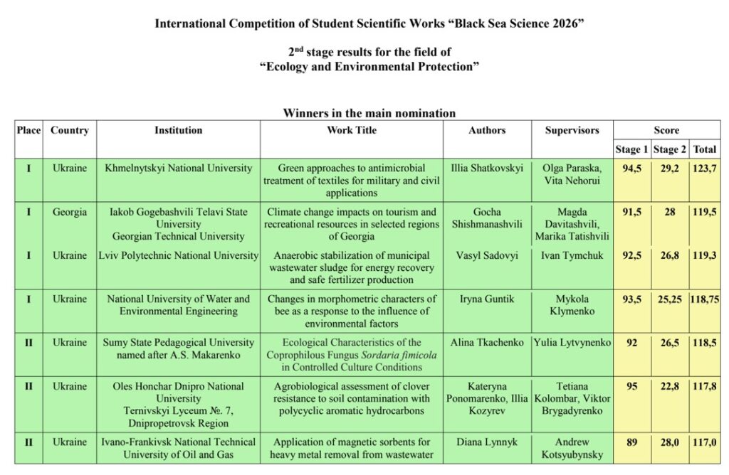 За результатами презентацій та доповідей учасників, журі визначало переможців і розподіл призових місць. Пишаємося досягненнями студентів кафедри хімії та хімічної інженерії ті вітаємо студента групи ХТІ-25-1 Іллю Шатковського та його наукових керівників Ольгу Параску і Віту Негоруй з перемогою за напрямом екологія та охорона навколишнього середовища. Всі учасники та наукові керівники будуть нагороджені сертифікатами, а роботи переможців опубліковані в збірнику робіт міжнародного конкурсу студентських наукових робіт «Black Sea Science».