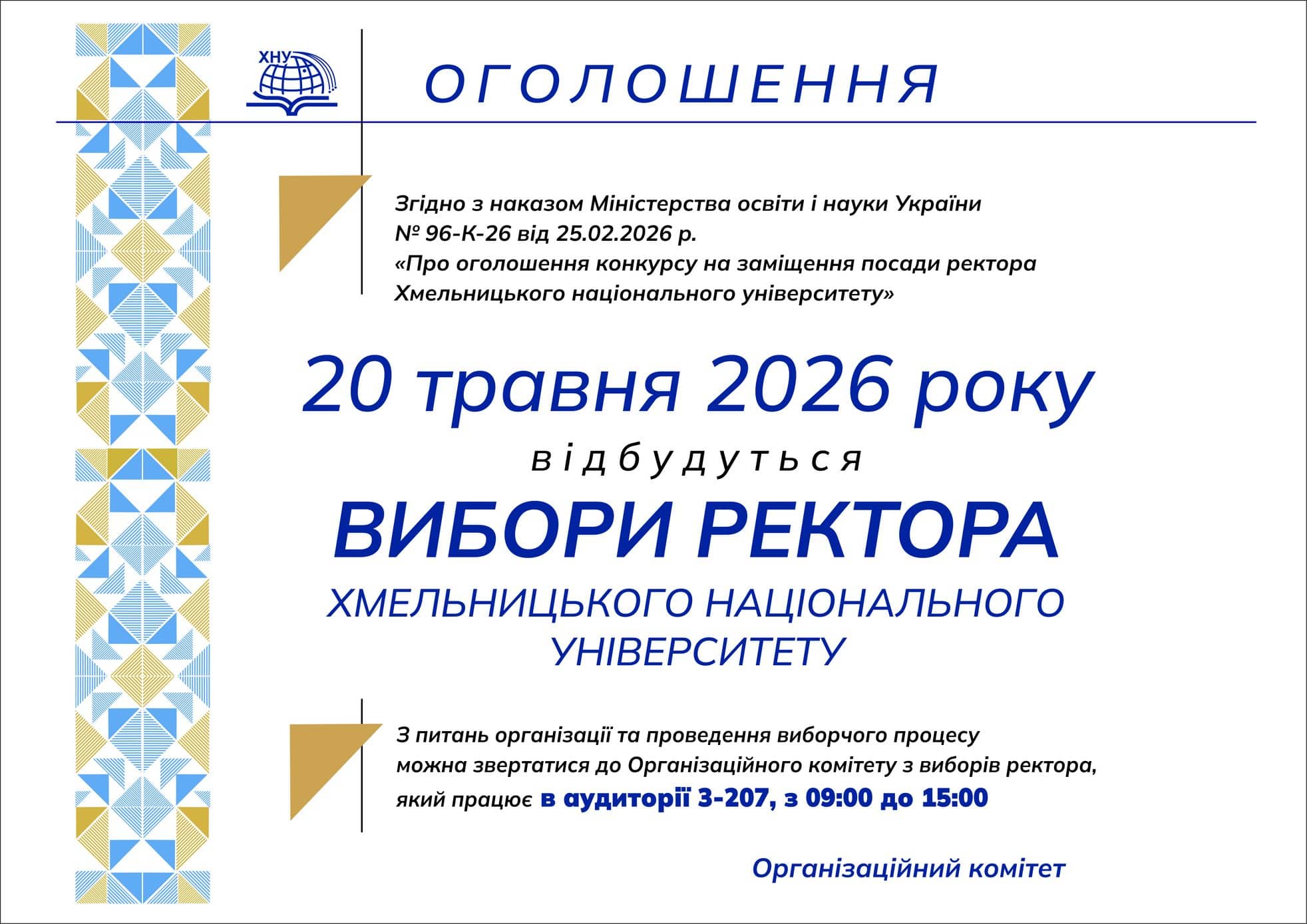 Наказ Про оголошення конкурсу на заміщення посади ректора Хмельницького національного університету